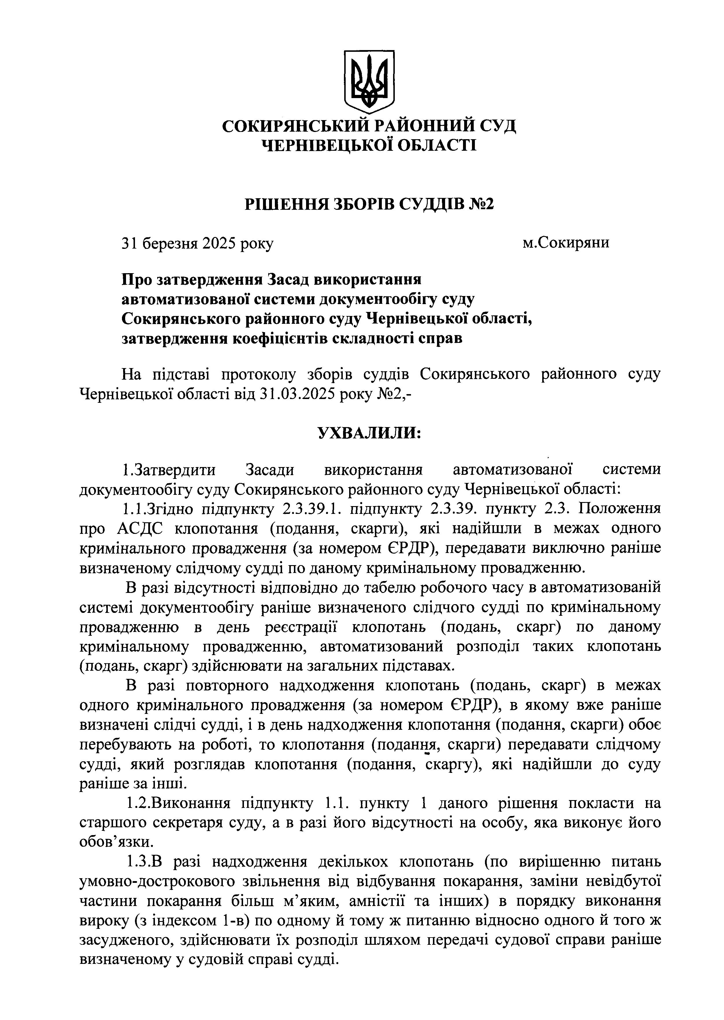 Рішення зборів суддів №2(Про затвердження Засад використання автоматизованої системи документообігу суду Сокирянського районного суду Чернівецької області, затвердження коефіцієнтів складності справ)