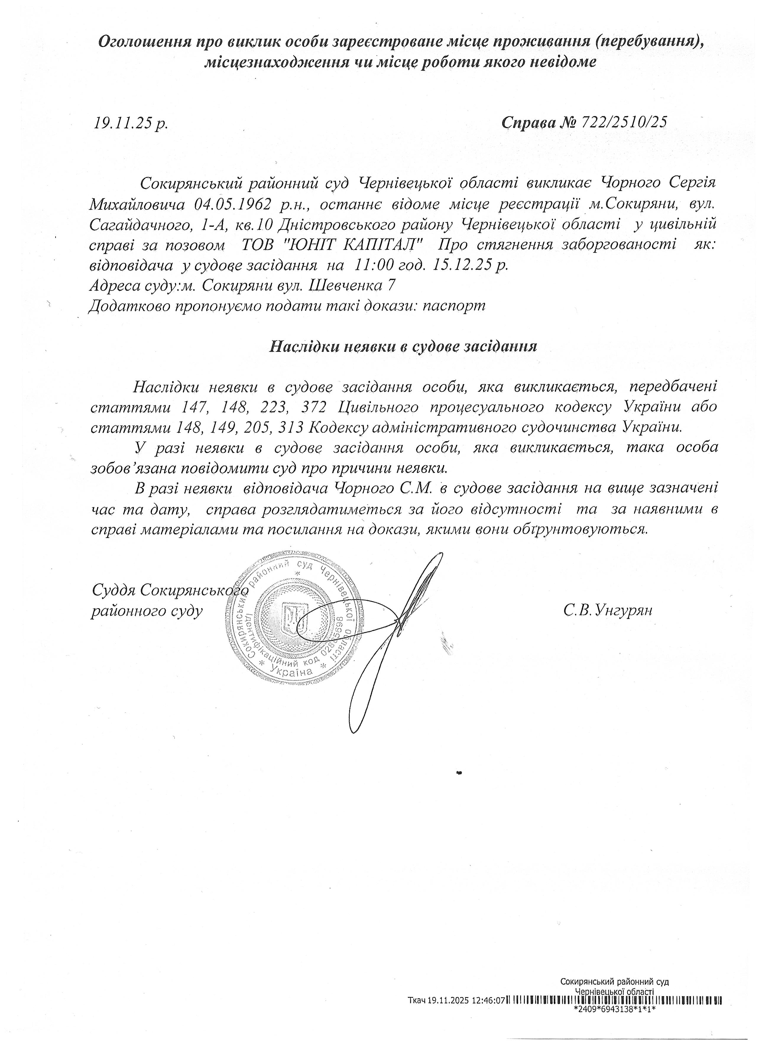 Оголошення про виклик до суду Чорного Сергія Михайловича