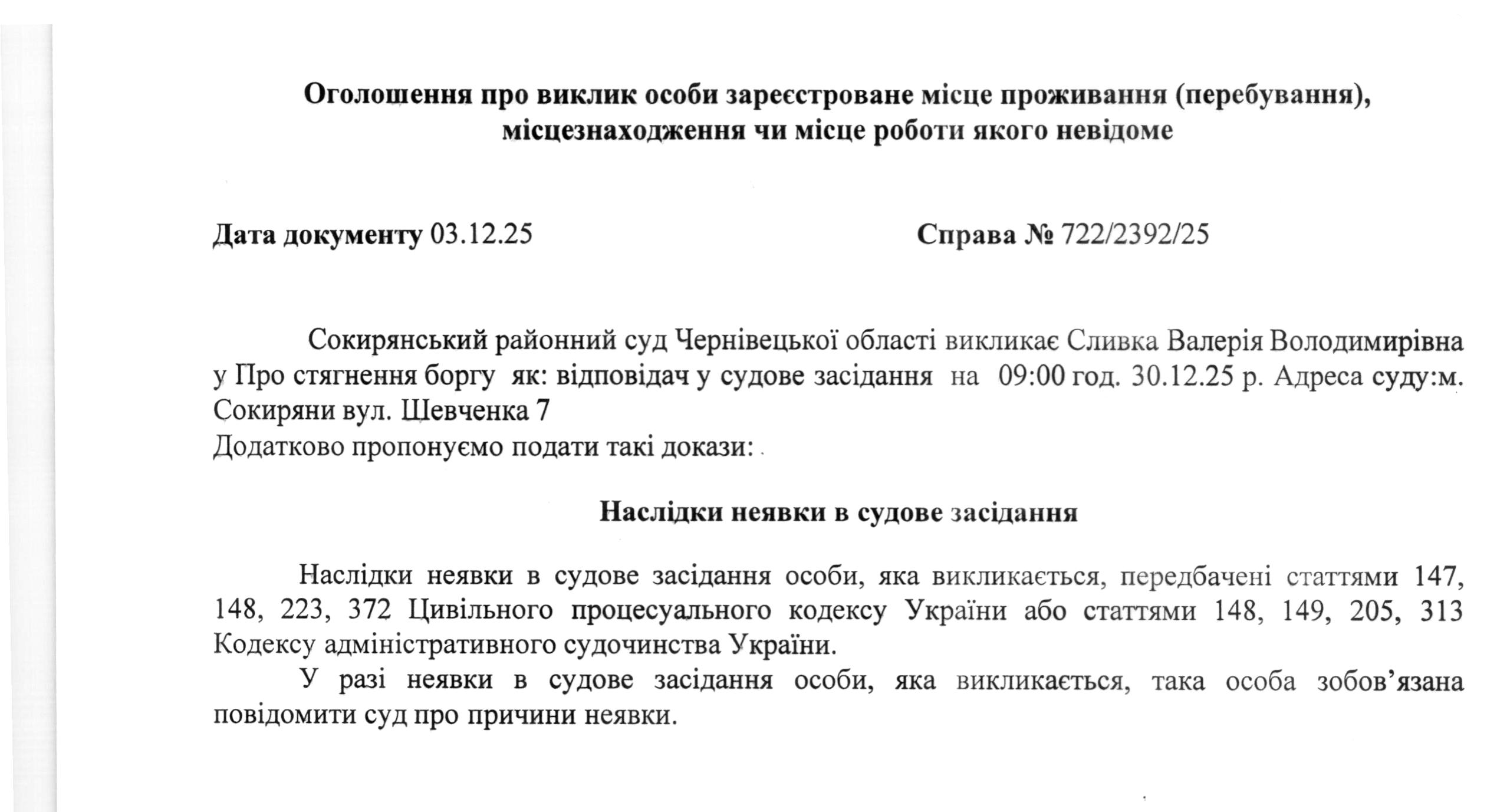 Оголошення про виклик до суду Сливка Валерія Володимирівна