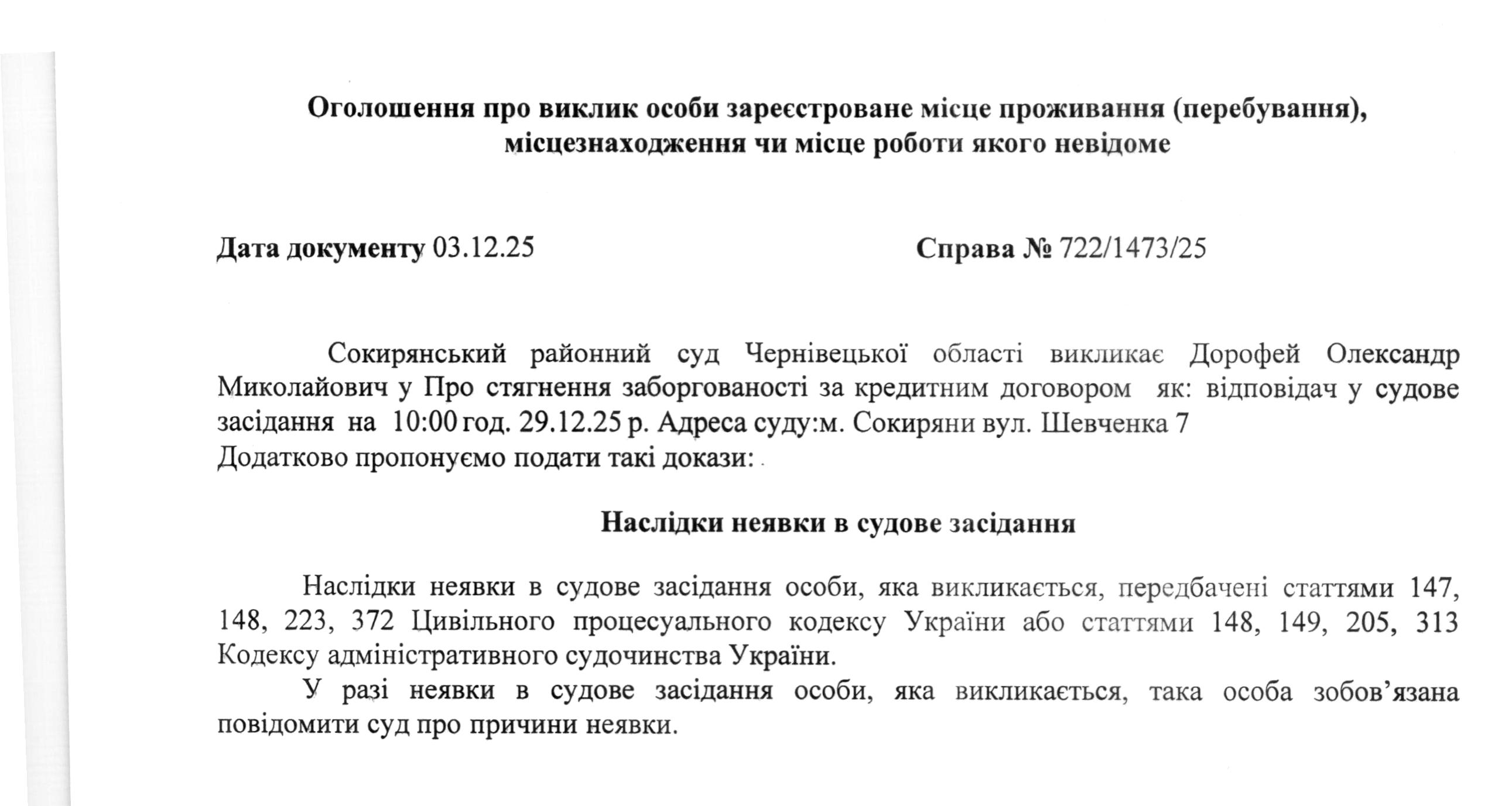 Оголошення про виклик до суду Дорофей Олександр Миколайович
