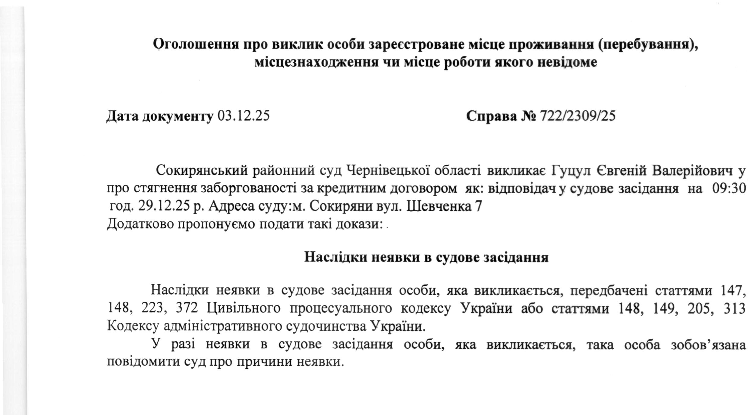 Оголошення про виклик до суду Гуцул Євгеній Валерійович