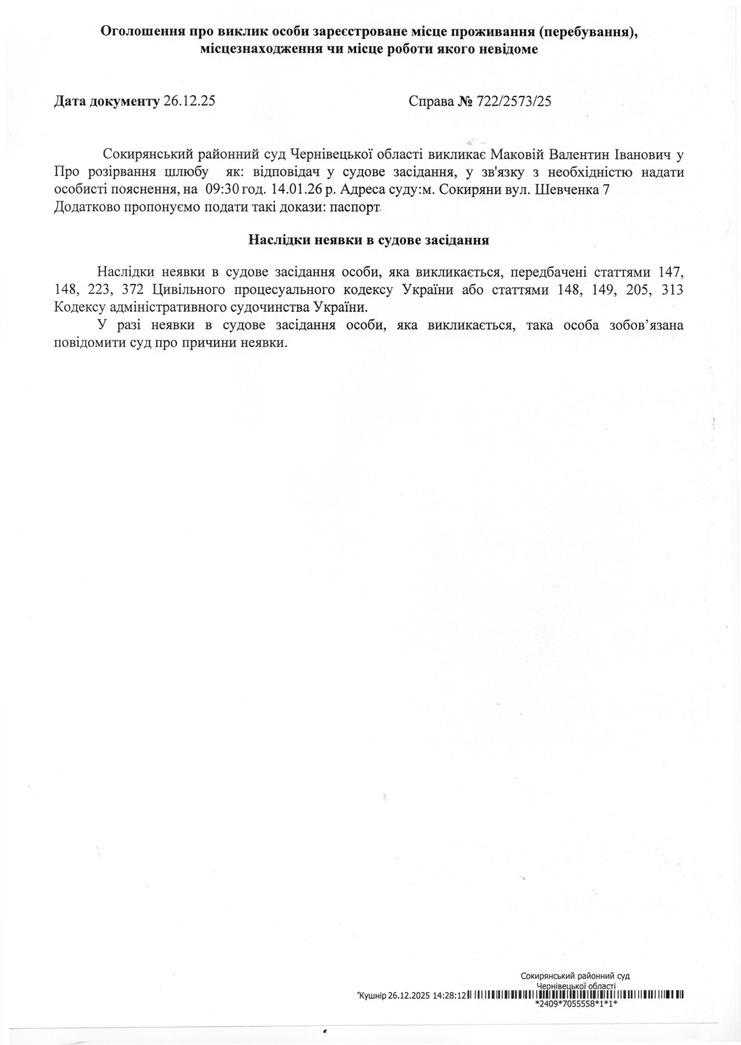Оголошення про виклик до суду Маковій Валентин Іванович